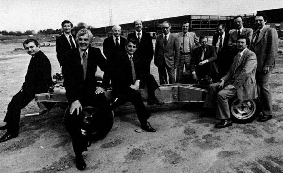 Stood around the prototype are:- The Belfast team with DeLorean Gene Cafiero in the centre foreground. On the left is Shaun Harte and behind him Tony Hopkins of NIDA. Back row: Hopkins, Alex Fetherston (NIDA representative on the DMCL board), Myron Stylianides, Joe Daly, David Adams (not a director), George Broomfield, Mike Loasby, Robert Donnell. Chuck Bennington and Brian Beharrell (right) are in the foreground.